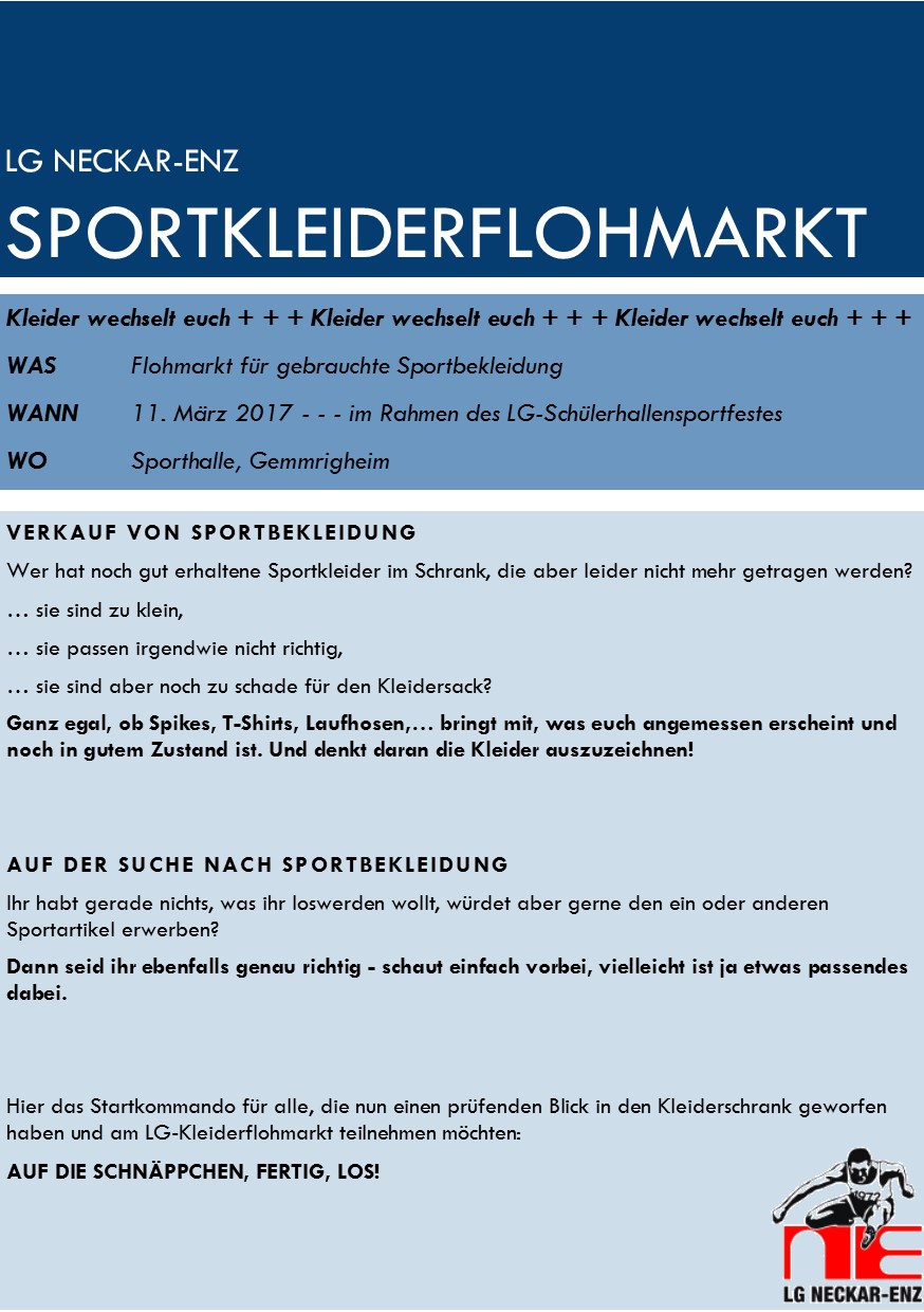 Im Rahmen des Hallensportfestes wird es auch den 4. Flohmarkt für gebrauchte Sportbekleidung geben. Alle Details findet Ihr im Flyer.