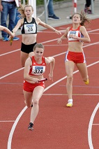 Der absolute Höhepunkt aus LG-Sicht folgte dann am Ende des ersten Veranstaltungstags. Die Olympische Staffel der weiblichen Jugend U 20 war dabei eine sehr spannende Angelegenheit. Marie Weller übernahm als Startläuferin gut den 400 Meterpart, bevor Melanie Böhm und die überzeugende Lisa Durian (TSV Bietigheim) nach jeweils 200 Metersprints an Kim Großmann (Spvgg. Besigheim) übergaben. Diese ließ sich von den knapp 20 Meter Rückstand nicht beirren und setzte die führende Konkurrentin der Startgemeinschaft Gomaringen-Schwäbisch Hall mächtig unter Druck. Nach und nach verkürzte sie den Rückstand und schob sich in einem harten Fight in der letzten Kurve vorbei an die Spitze. Mit 4:07,26 Minuten waren die LG-Goldmädels sehr schnell unterwegs.